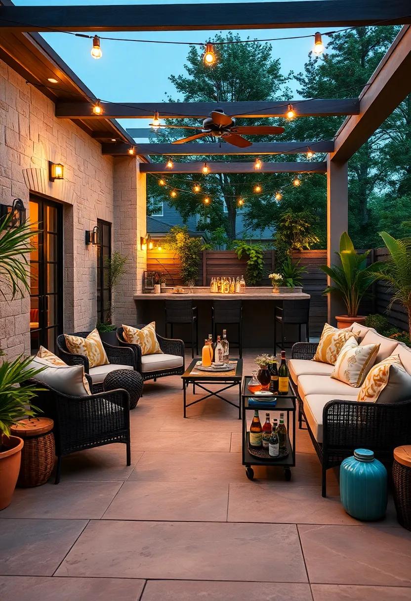 Elegant Lounge Bar: feature stylish bar stools and a high table with ambient lighting for outdoor cocktail hours, complete with a small bar cart stocked with your favorite drinks