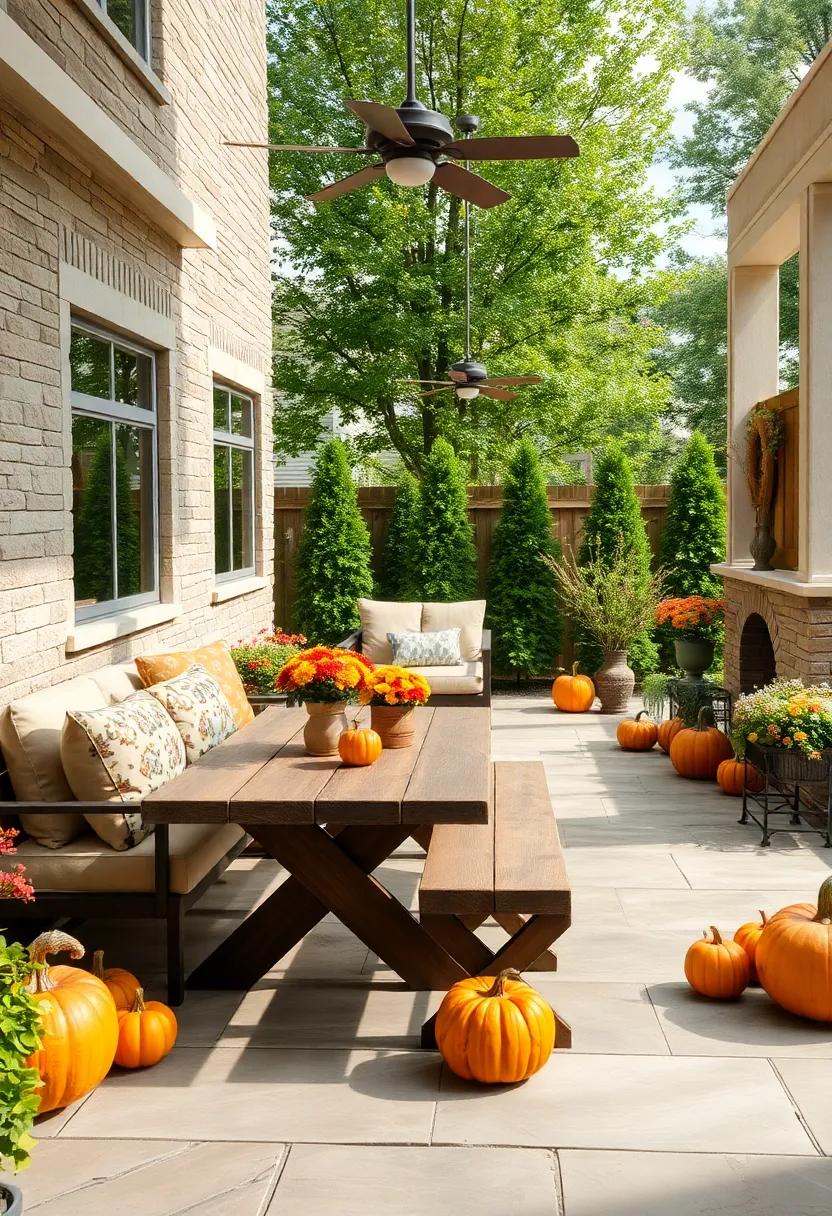 Transform your outdoor area into the ultimate harvest gathering space by incorporating large, sturdy benches and a robust dining table that can accommodate friends and family alike. Imagine vibrant gatherings filled with laughter and warmth as you share tasty fall meals under the crisp autumn sky. To create a welcoming atmosphere, adorn your table with plump pumpkins in various sizes, nestled alongside seasonal flowers like chrysanthemums and sunflowers, which add vivid color and a natural touch. Enhance the ambiance further with twinkling fairy lights woven through the surrounding trees or along the edges of the table for a cozy glow as daylight fades.
