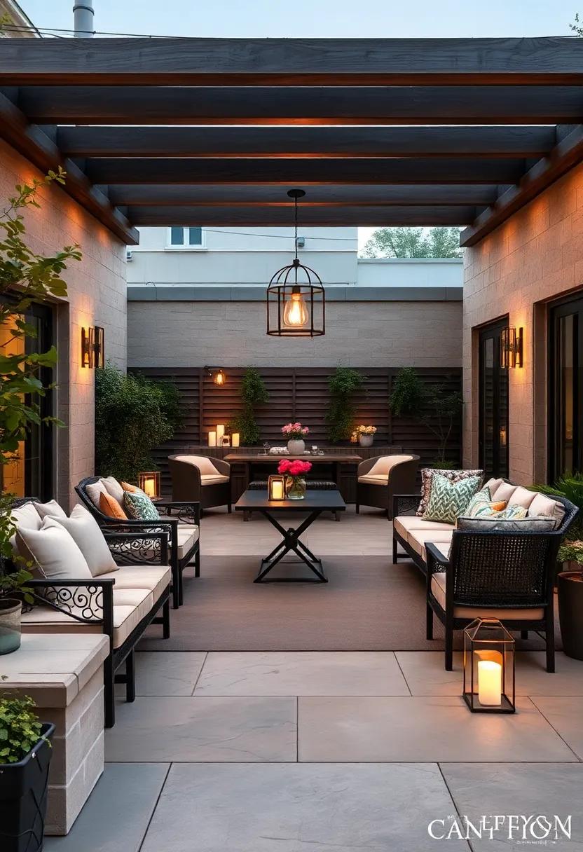 Sit in style with upholstered chairs that offer comfort and elegance, complemented by soft cushions in coordinating shades. Enhance the mood with ambient lighting such as string lights draped overhead or charming lanterns positioned around the seating area. Use candles for a warm glow that flickers gently,creating an inviting warmth as the sun sets. Consider incorporating elements like a small outdoor rug to define the dining area, making it feel more intimate and welcoming for dinner parties under the stars.