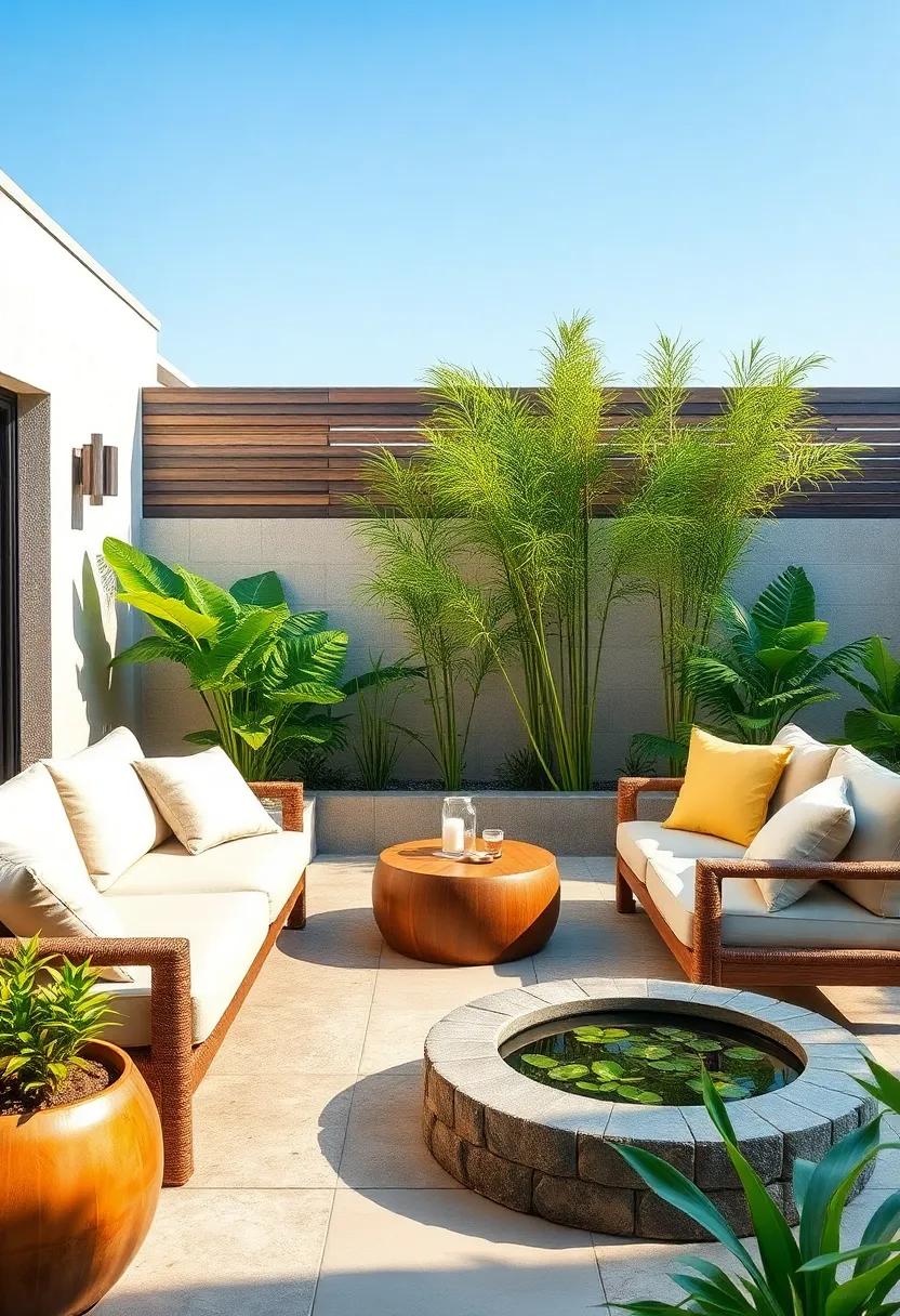 Tranquil Zen Garden: Use minimalist furniture with natural textures, paired with bamboo plants and a calming water feature to foster a peaceful outdoor retreat