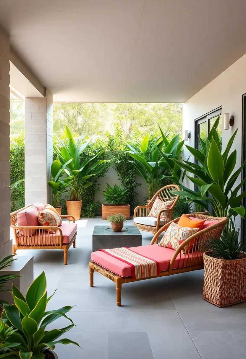 Tropical Oasis Vibes: Use vibrant, patterned cushions and lush greenery to create a tropical escape, complete with a bamboo lounge chair and a small water feature for ambiance
