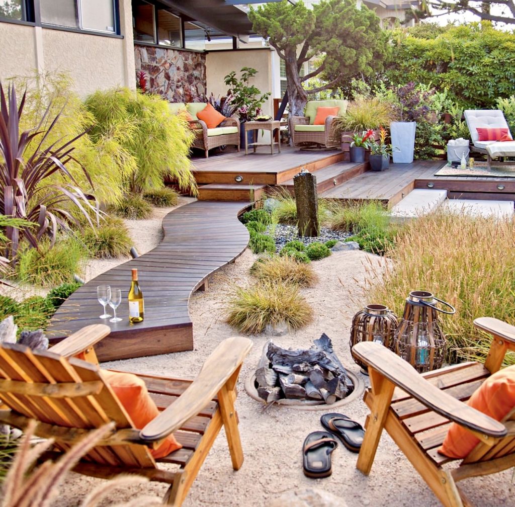 Utilizing flowing, natural shapes, this backyard design softens its compact footprint with a winding wooden path that meanders through clusters of wild grasses and textured plants. Adirondack chairs encircle a subtle fire feature, creating a warm gathering spot that feels both modern and organic. The low-maintenance plant selection keeps costs down while delivering a designer-quality outdoor experience.