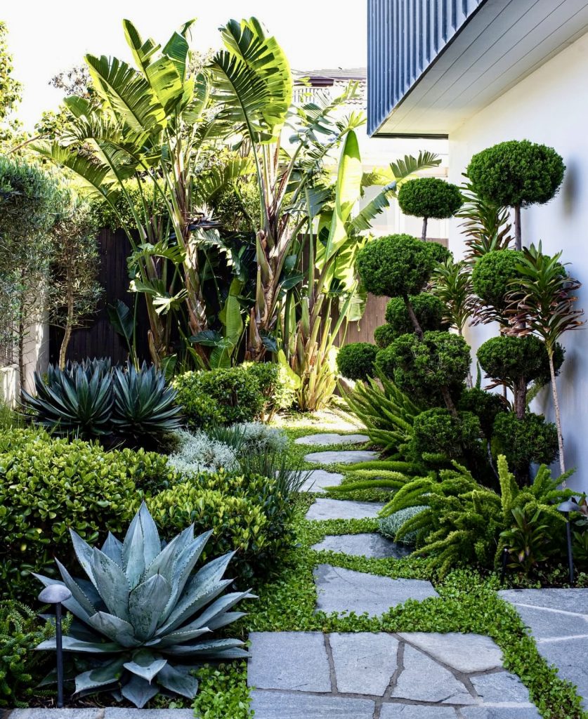 This dramatic tropical pathway transforms a narrow strip into a lush escape with architectural plants like agave, palms, and sculpted shrubs that provide texture and privacy. The irregular stone path blends seamlessly with groundcover, creating a wild yet intentional vibe. Perfect for those wanting a standout backyard with minimal upkeep, this design balances boldness with practicality.