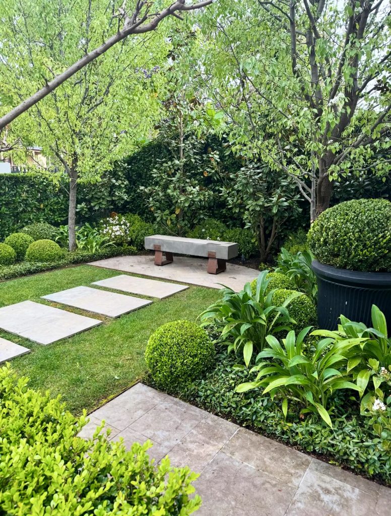 Embracing 2026’s trend for clean, structured landscapes, this compact garden features neatly trimmed boxwoods, layered shade trees, and polished stepping stones. The symmetrical layout culminates in a bench that invites quiet reflection, creating a serene park-like atmosphere. This budget-friendly design relies on thoughtful plant selection and maintenance rather than costly hardscaping, making it an excellent choice for a peaceful retreat.