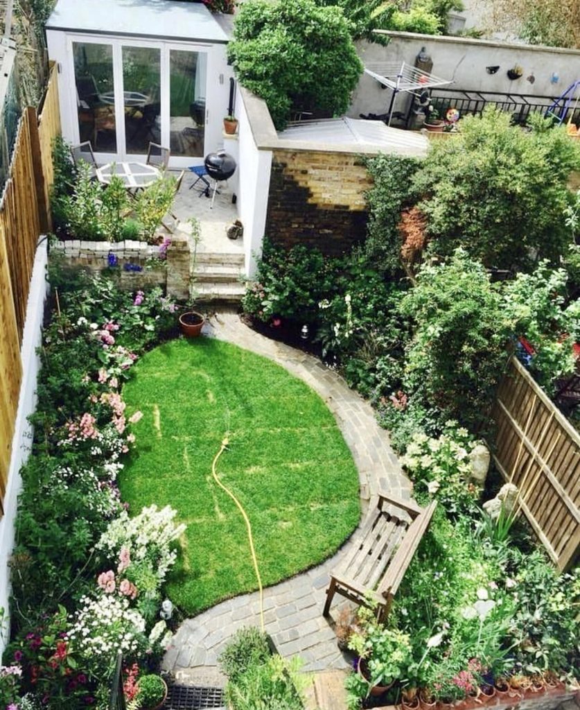 A bright, well-manicured lawn serves as the focal point in this compact yard, surrounded by raised flower beds that add height and bursts of color. A stepping-stone path ensures smooth circulation without disrupting the greenery. This design is ideal for families seeking a clean, classic garden look that remains fresh and manageable in 2026. The vertical layering of plants along the borders enhances the sense of space and structure.
