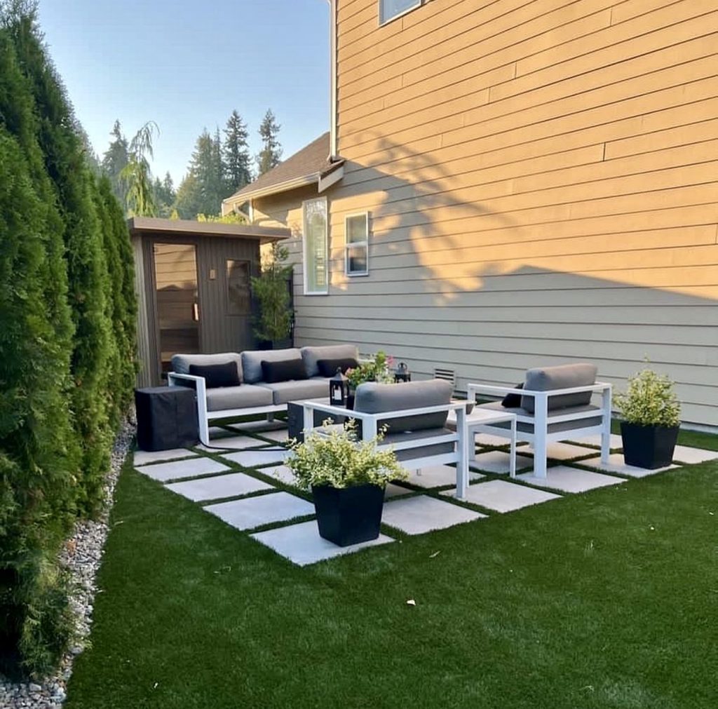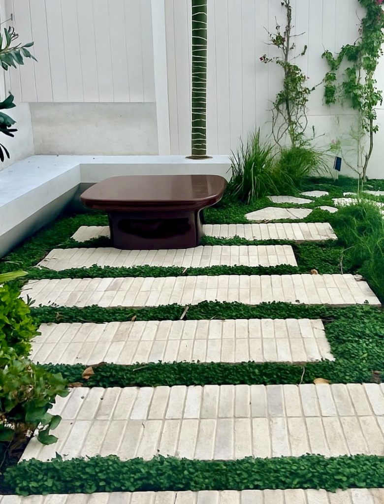 Rectangular stepping stones set amidst green groundcover create a minimalist, contemporary patio that feels open and uncluttered. Modern furniture complements the clean lines, while vertical planting and a white privacy wall balance openness with seclusion. This design is ideal for homeowners seeking a polished, modern backyard that supports social gatherings without sacrificing style.