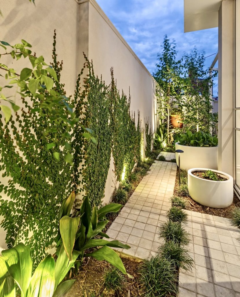 Evening lighting transforms this side garden into a luxurious retreat. Vertical vines contrast beautifully with high walls, while in-ground uplights add drama and depth. A tiled path ensures functionality, and large planters introduce greenery without crowding the space. This budget-friendly design proves that strategic lighting and foliage can elevate even the smallest yards.