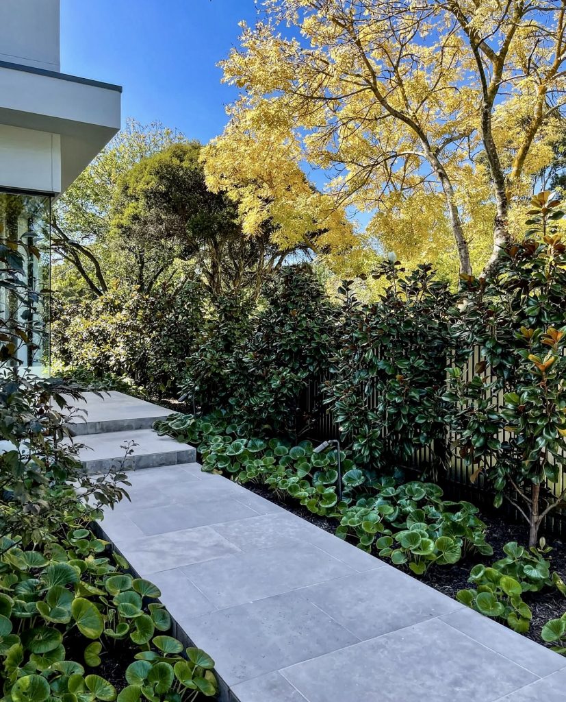 Featuring clean concrete walkways flanked by dense evergreen hedges, this design offers a bright, elegant route through the yard. The tall privacy plants create a secluded atmosphere, perfect for those seeking a tranquil outdoor path. The minimalist approach ensures ease of maintenance while delivering a sophisticated modern look.