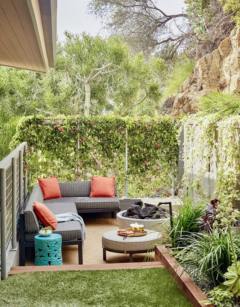 This inviting terrace features L-shaped seating adorned with warm cushions and a fire feature, perfect for chilly evenings. Vertical greenery provides privacy, creating a retreat-like ambiance in a compact space. This design exemplifies purposeful layout and cozy fire pit ideas suitable for small yards.