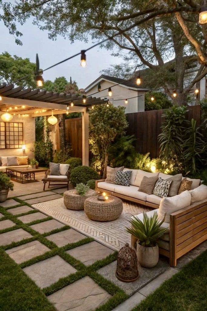 This layered garden combines a pergola, string lights, plush furniture, and lush plants to create a peaceful oasis in a small space. Stepping stones add charm and functionality, demonstrating budget-conscious design. This setup balances relaxation with modern style and is suitable for pet owners.