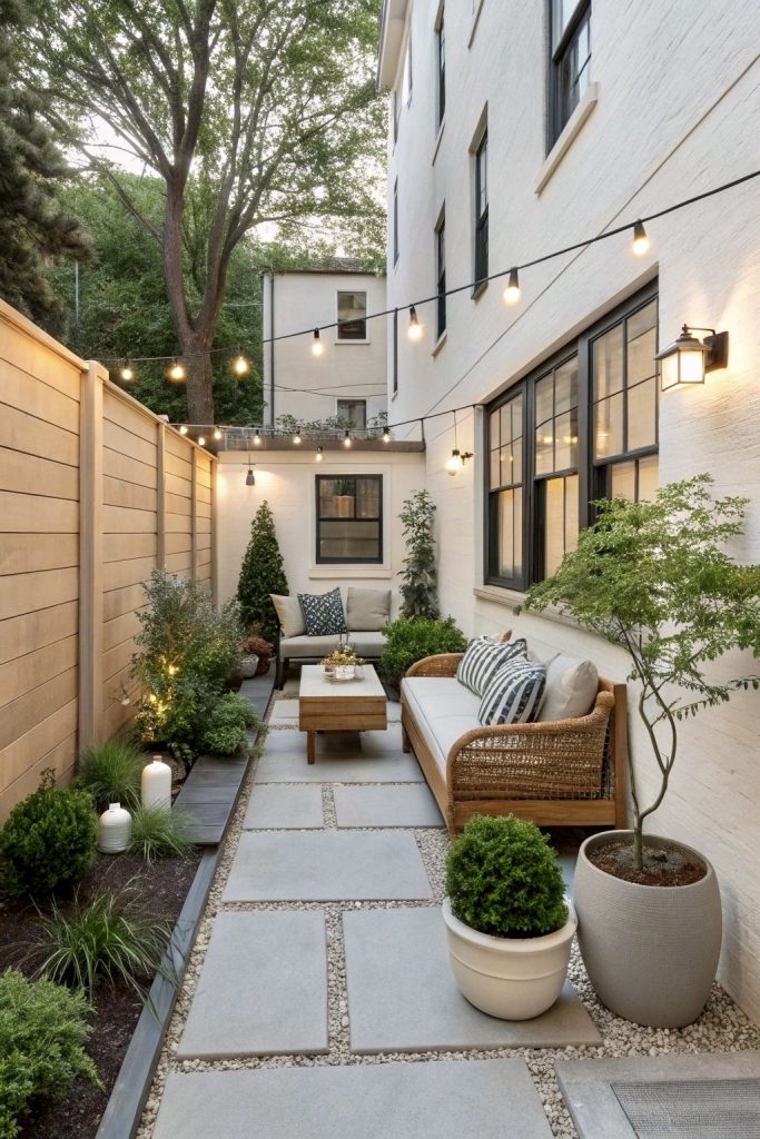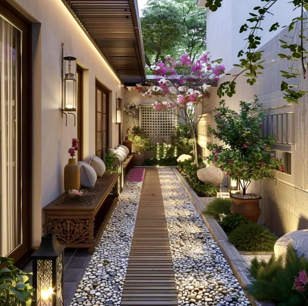 This narrow courtyard transforms a tight space into a functional outdoor living room. A long paver walkway guides movement, while woven seating, soft cushions, and lantern lighting create an intimate atmosphere. Layered pots, compact shrubs, and climbing plants provide privacy without crowding the area. This budget-friendly design relies on smart furniture placement and easy-care plants, making it ideal for urban homes and pet owners.