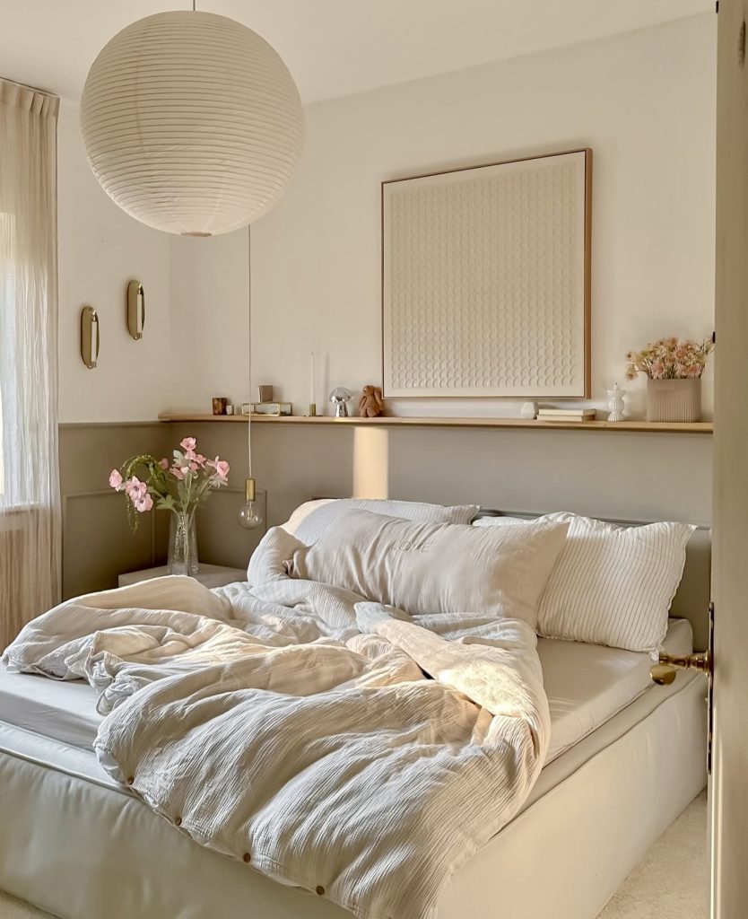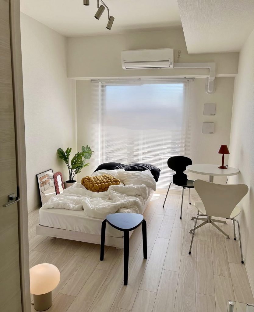 This minimalist bedroom captures the serene beauty of everyday life with light flooring and uncluttered decor. A single potted plant and sculptural lighting add warmth without compromising simplicity. The low-profile bed frame enhances openness—a clever layout for small city apartments. Soft, neutral bedding reinforces calm, while subtle details reflect refined design sensibility. It’s proof that small spaces can feel expansive with thoughtful balance.