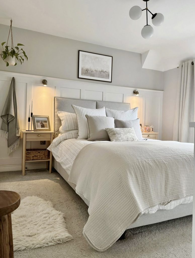 Featuring clean lines and warm illumination, this timeless bedroom layout exudes an inviting ambiance. Architectural details like paneled walls and built-in sconces add depth, while layered bedding enhances softness. Thoughtful accents such as hanging plants and framed artwork provide personality without overcrowding. This design suits both singles and couples seeking modern coziness, reminding us that interior tranquility stems from mindful composition and equilibrium.