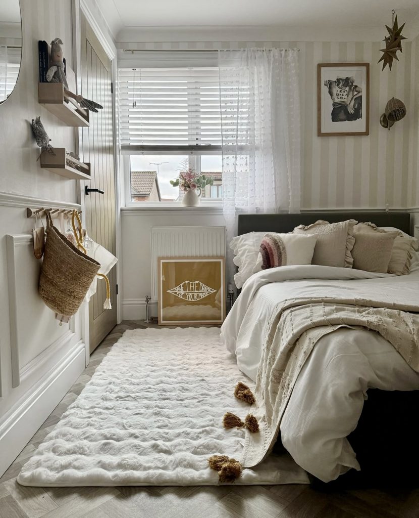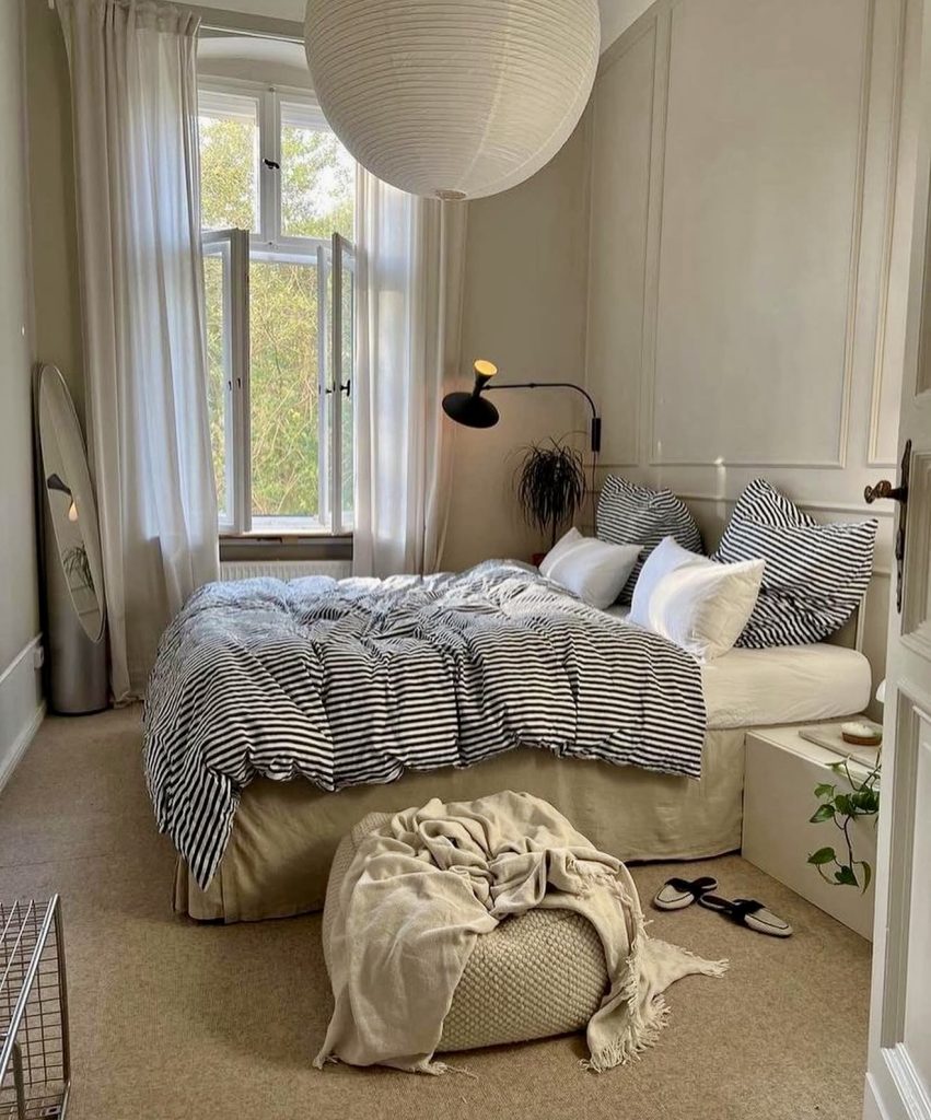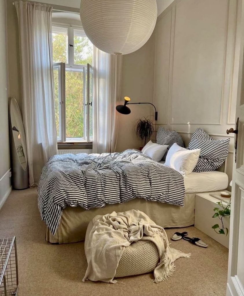 This compact bedroom marries timeless charm with contemporary flair, illustrating how stripes can visually elongate and energize small spaces. Tall windows paired with sheer curtains flood the room with natural light, enhancing the neutral and soft gray palette. A knitted pouf and cozy throw add tactile warmth, embodying clever cozy room decor ideas suitable for any apartment. The sleek black wall lamp introduces a modern edge while conserving surface area. This design strikes a harmonious balance between character and comfort.