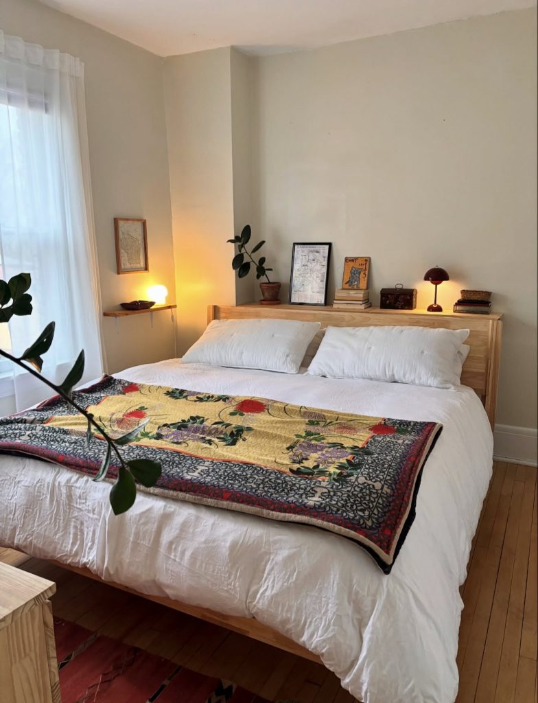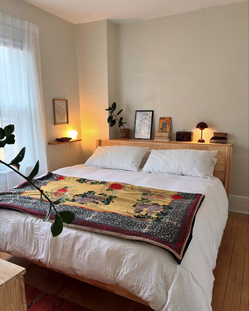 A vintage-inspired throw transforms this modest bedroom into a vibrant celebration of culture and color. Natural wood tones paired with crisp white bedding create a cozy base, while layered accents narrate stories of travel and creativity. This space embraces design freedom by blending traditional patterns with minimalist furnishings. Warm lighting and lush houseplants breathe life into the room, crafting a cozy atmosphere that feels both lived-in and inspiring. Perfect for those who cherish intentional and unique decor.