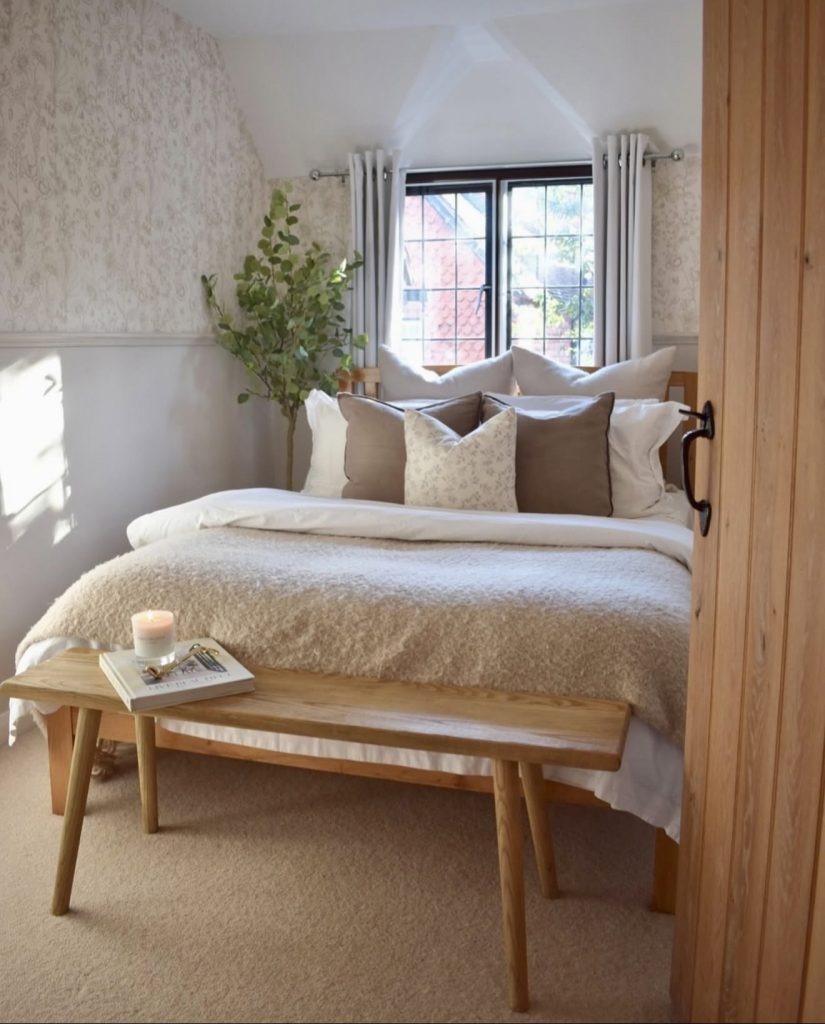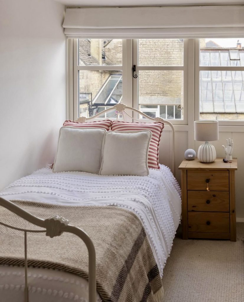 This delightful bedroom draws inspiration from English cottage aesthetics, featuring crisp white bedding with textured details that evoke calmness. Red-striped cushions add warmth and a nostalgic touch. A natural wood nightstand offers both character and practical storage, ideal for those who want cozy room decor without clutter. The design’s simplicity allows architectural features and natural light to shine, making it perfect for historic or compact homes valuing comfort and authenticity.