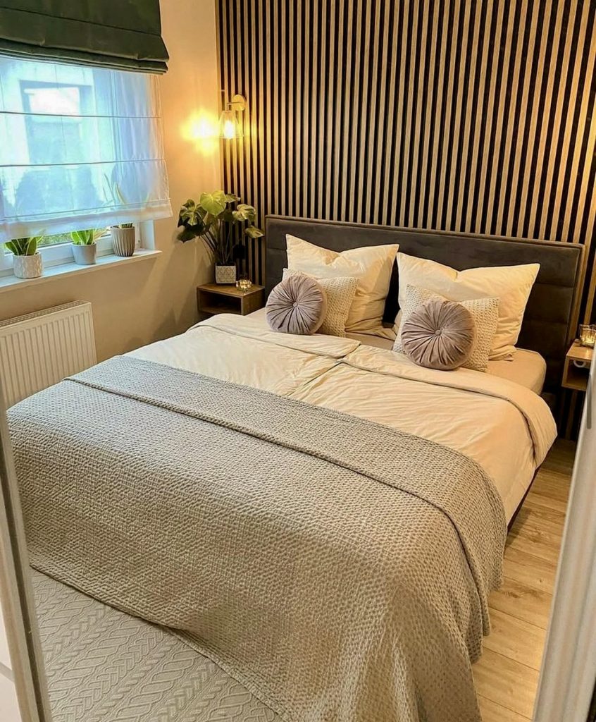 A bold wood accent wall immediately defines this space, illustrating how design can make a small room feel dramatic yet refined. Vertical paneling draws the eye upward, adding height and rhythm. Combined with warm lighting and layered bedding, the room feels both elegant and inviting. The palette of soft taupe and muted gold exudes luxury while maintaining coziness. This look suits those wanting a striking transformation without compromising comfort or practicality.