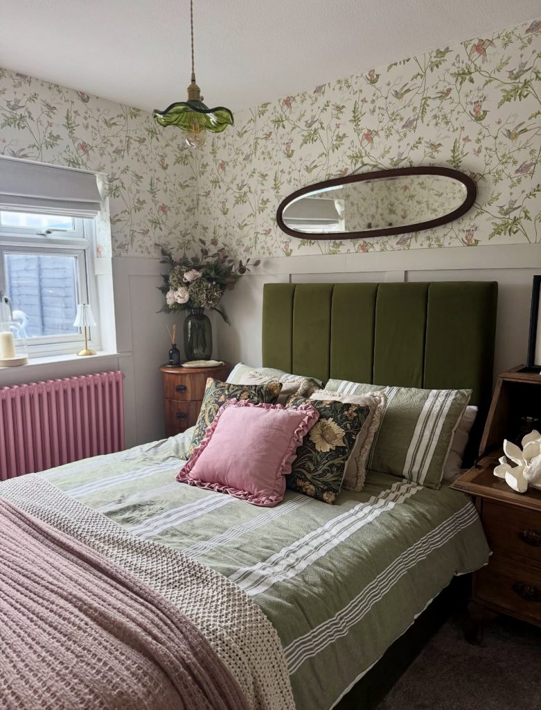 This enchanting bedroom combines vintage sophistication with fresh botanical energy. A green velvet headboard paired with soft pink accents creates a cozy yet elegant ambiance, ideal for fans of English cottage decor. Floral wallpaper adds nostalgic depth while keeping the space airy. Layered linens and knit textiles provide texture without overcrowding. It’s a timeless example of romantic, personalized interior design.