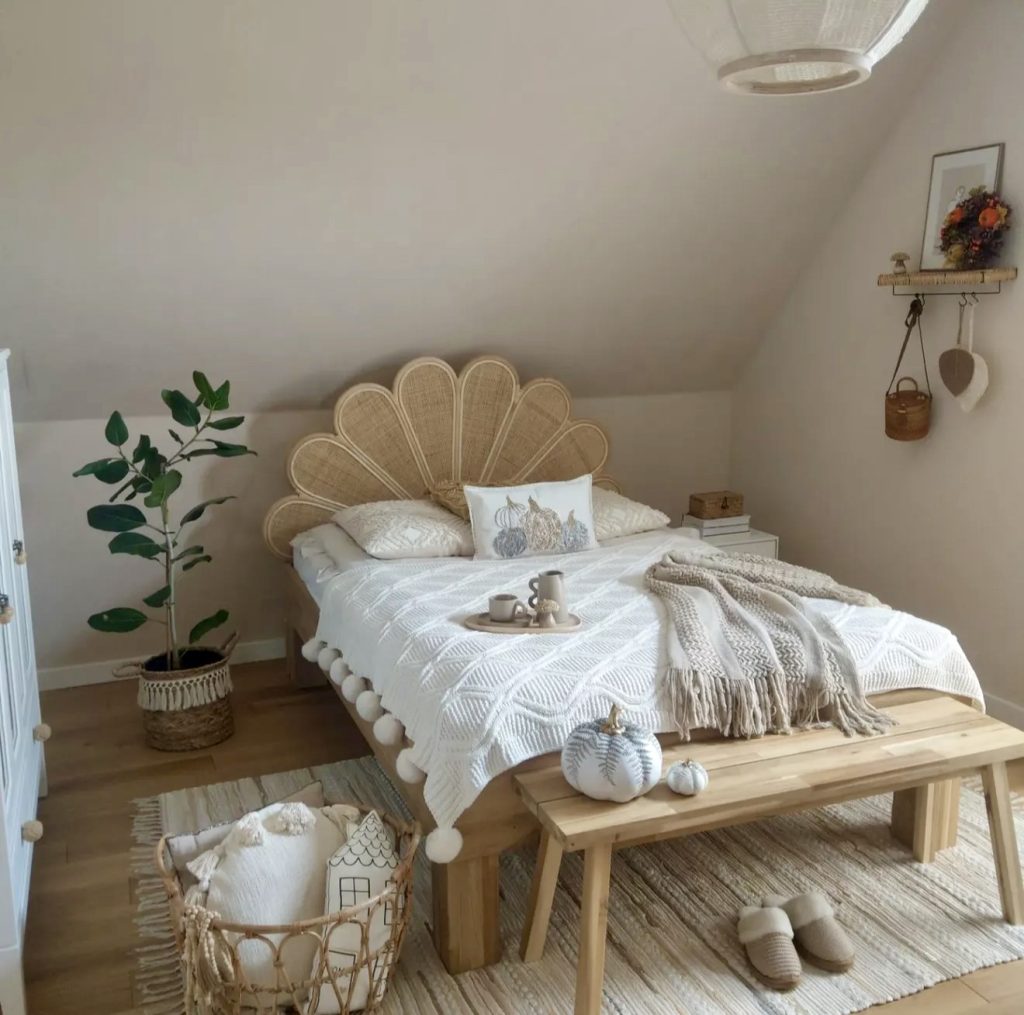This serene bedroom blends Japandi minimalism with bohemian charm, combining calm simplicity and artisanal details. A rattan headboard, soft white fabrics, and woven baskets enhance the natural, tranquil vibe. Light wood furniture and neutral tones keep the space bright and harmonious. Small touches like cozy slippers and neutral throws add warmth, making it perfect for kids’ rooms or couples who appreciate earthy, stylish living.