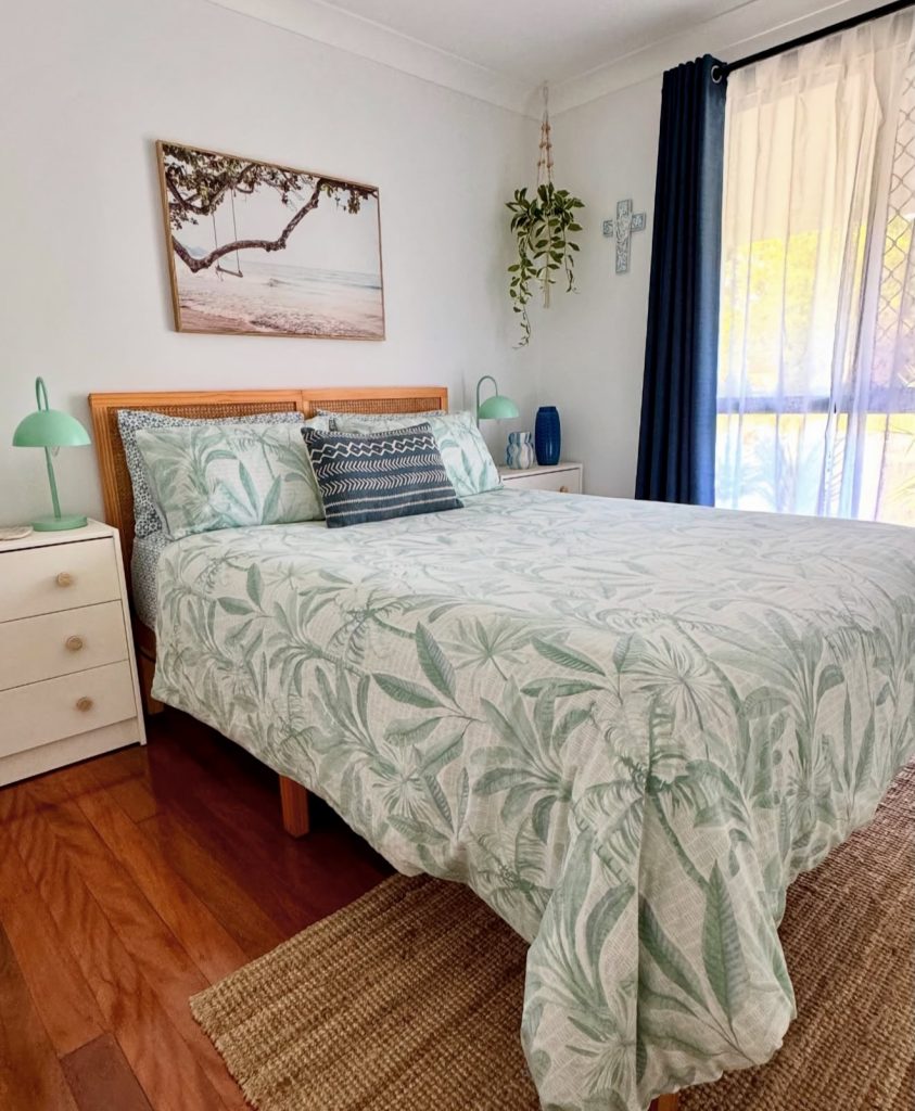 Evoking a coastal retreat, this sun-drenched bedroom features palm-print bedding and soft green hues. Light wood furnishings and woven accents add warmth while maintaining a fresh, airy feel. Hanging plants and ocean-inspired artwork complete the look, illustrating how nature effortlessly elevates interior design. This simple, breezy layout is perfect for small spaces craving calm and color, embodying a timeless tropical modern aesthetic.