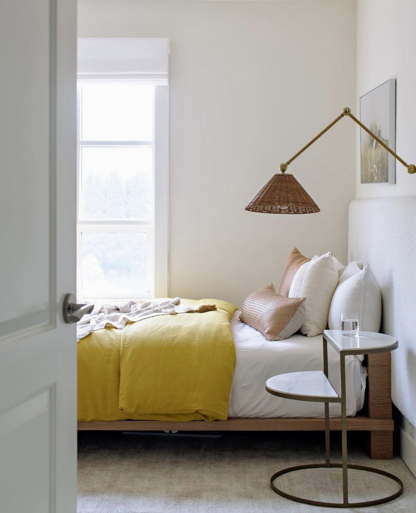 Combining warm mustard tones with neutral shades, this airy bedroom maintains a clean, spacious atmosphere. A metallic wall sconce adds subtle character while conserving floor space. Each decor element is intentional, with simple framed artwork providing focal points. Ideal for modern singles or couples, this room exudes cozy sophistication through understated contrasts that amplify its minimalist charm.