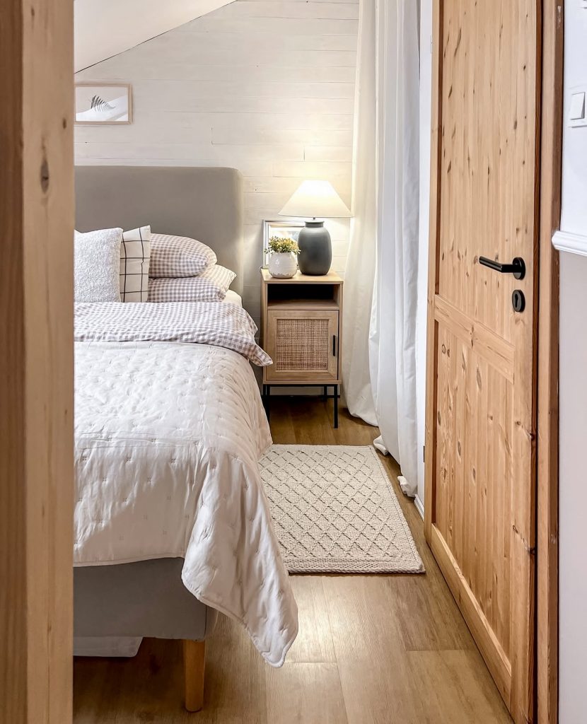This small bedroom fuses Scandinavian serenity with rustic warmth, featuring soft lighting and natural wood elements. A woven nightstand and neutral bedding emphasize texture and comfort. Pale walls open up the space, making it feel larger and more inviting. This design suits teens or guest rooms, offering cozy privacy with timeless appeal. It’s a welcoming take on cozy room decor that balances simplicity and style.