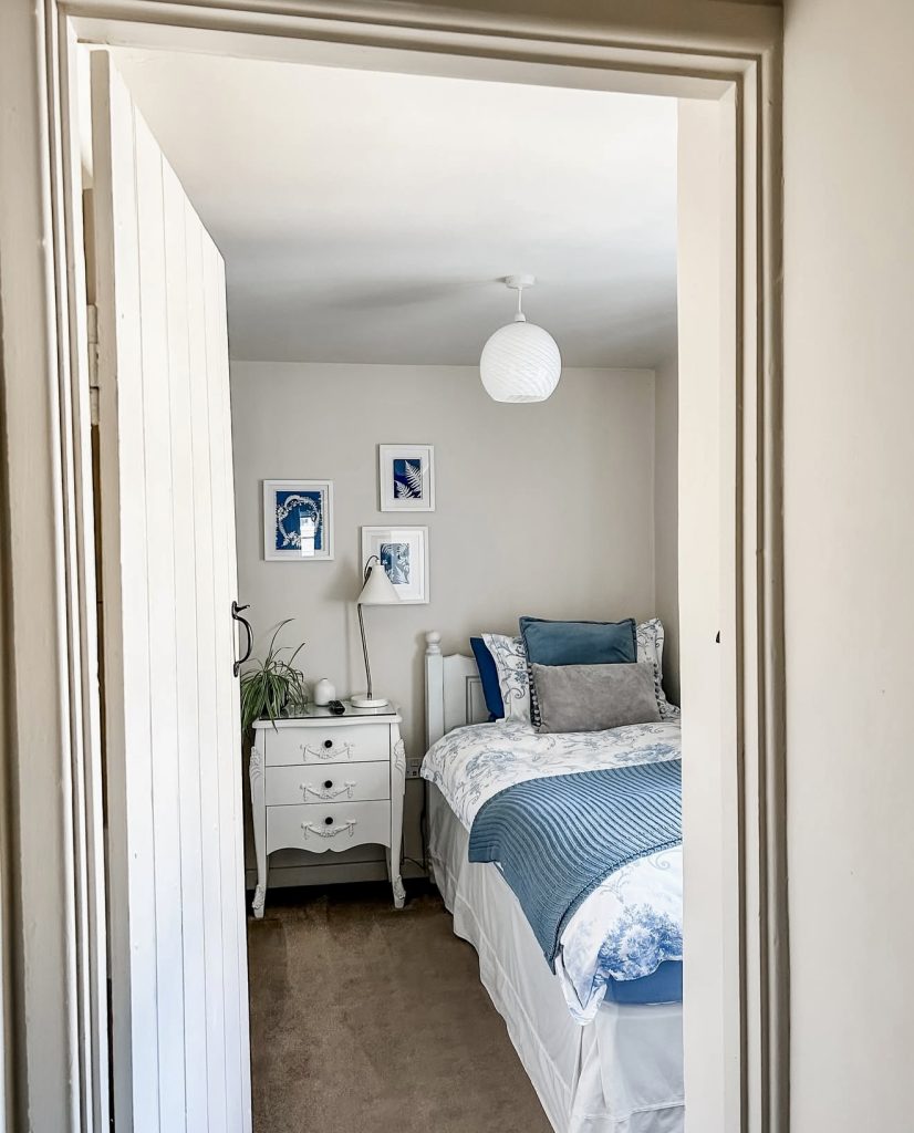 This compact bedroom features a timeless palette of crisp blue and white, creating a fresh yet polished look. Vintage furnishings combined with layered textiles offer balance and organization. Vertical lines and cohesive colors make the small space feel open and airy. This design suits both traditional and coastal tastes, ideal for couples who appreciate classic comfort with a contemporary edge.
