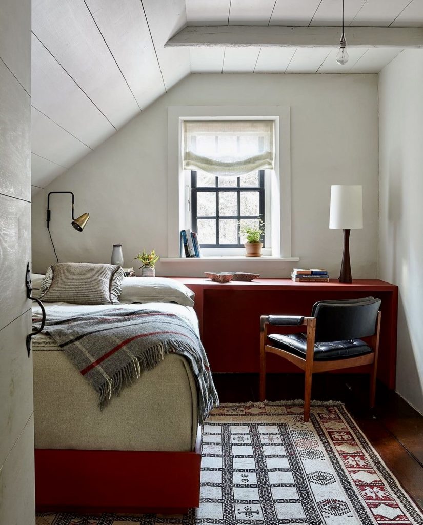 This attic bedroom blends traditional charm with modern design elements. Deep red furniture adds warmth and richness, contrasting with neutral bedding and a patterned rug. A multifunctional desk serves as both workspace and storage, showcasing smart layout solutions for limited space. A gold reading lamp introduces a refined retro touch, enhancing the cozy ambiance. This is a prime example of modern rustic style—minimalist yet full of character.
