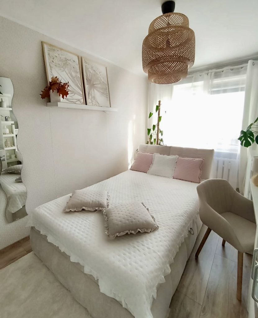 Soft pink hues and gentle textures define this inviting, feminine bedroom. A woven pendant light and layered bedding create a cozy, timeless atmosphere. Vertical mirrors and minimalist furniture optimize space and organization. This room proves that elegant design doesn’t require large square footage—just thoughtful selection. Perfect for those seeking cozy ideas that blend softness with simplicity.