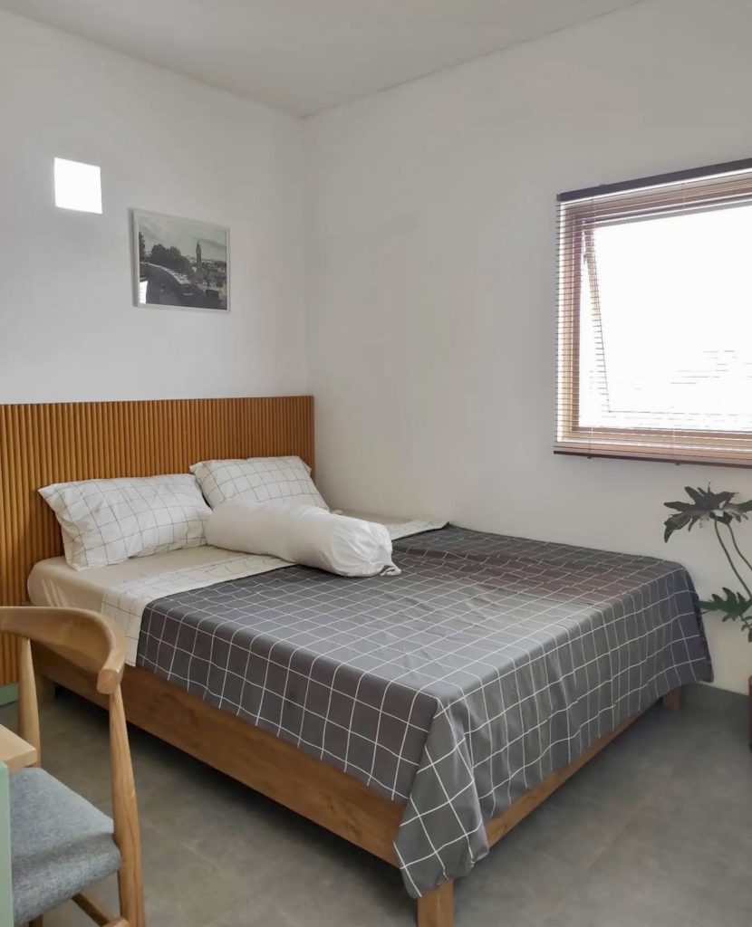 This compact bedroom showcases the power of clean lines and warm wood tones. Grid-patterned bedding adds visual rhythm, while a vertical headboard introduces subtle architectural interest. Natural light and minimal furnishings keep the space uncluttered, ideal for teens or minimalism lovers. Greenery softens the geometric lines, bringing nature indoors. It’s a practical yet cozy design balancing order and comfort.