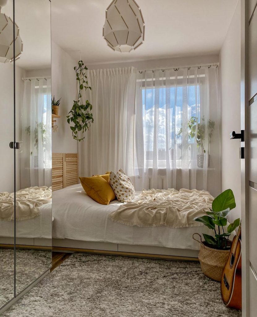 This design exemplifies cozy bedroom aesthetics through a soothing blend of creamy hues, natural sunlight, and organic textures. The mirrored wardrobe cleverly enlarges the room visually, while multi-layered bedding adds depth and softness. Suspended greenery introduces a natural element without occupying floor space. Accents like mustard and patterned cushions inject vibrancy, creating a cheerful yet balanced atmosphere. This setup is ideal for those seeking a serene yet modern minimalist retreat.