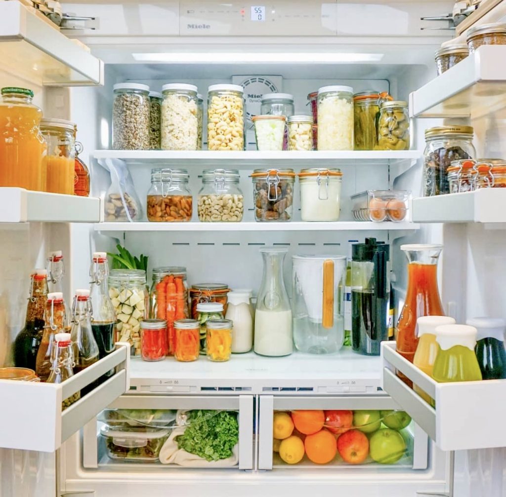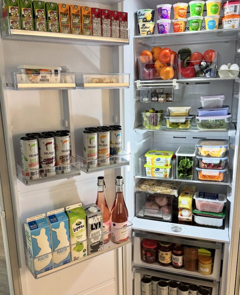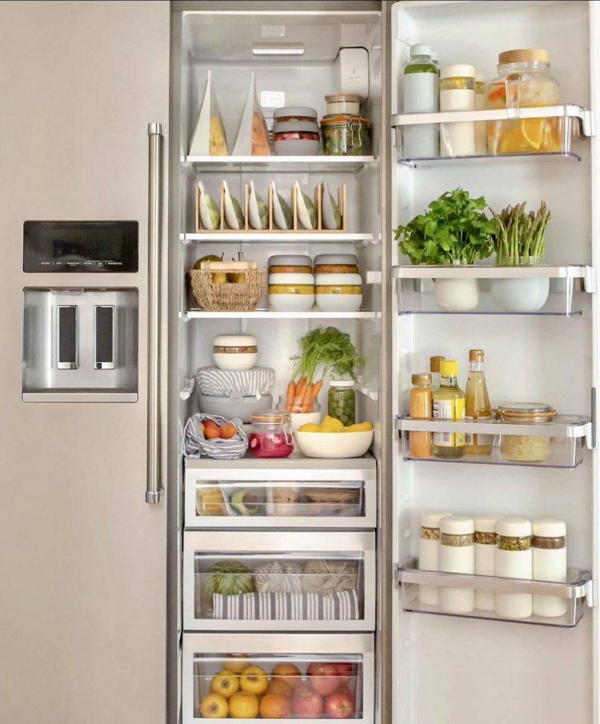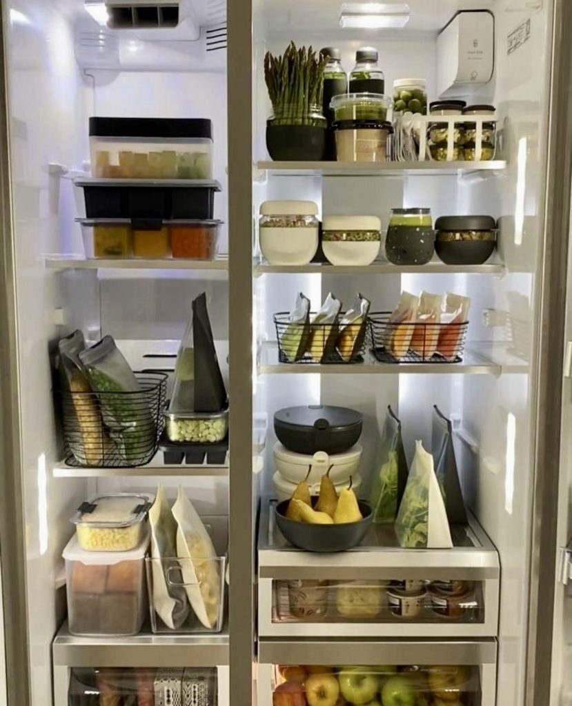 This plant-focused fridge is a vibrant display of colorful containers and mason jars filled with rainbow slaws, chopped greens, and prepped fruits ready for grab-and-go meals. Inspired by clean-eating philosophies, it’s ideal for vegetarians or vegans seeking a stylish and functional setup for their LG or Samsung refrigerators.