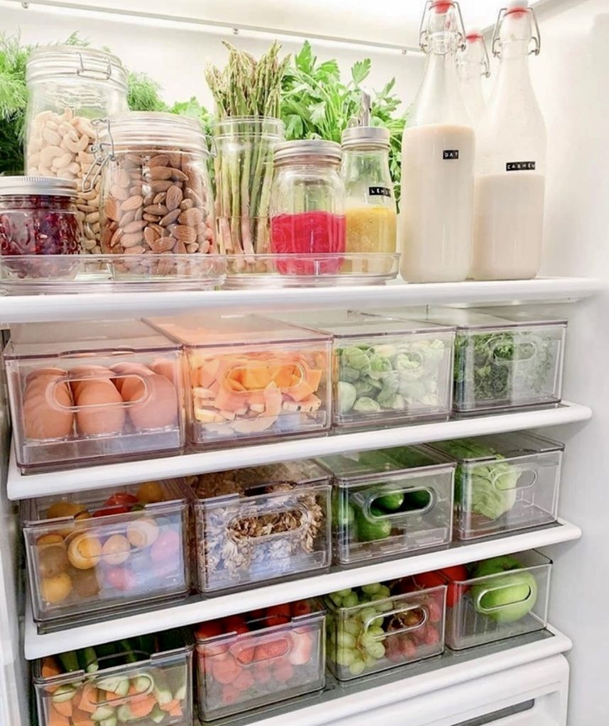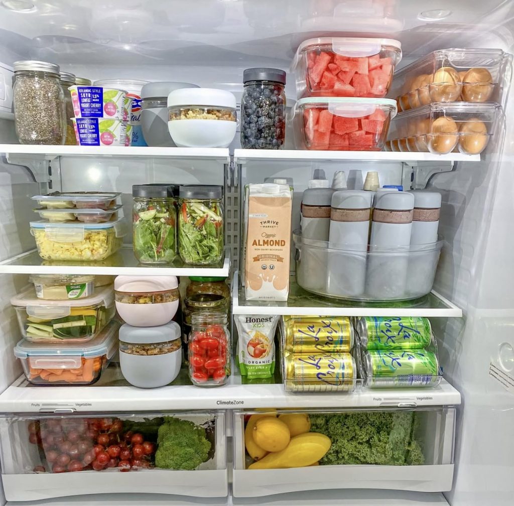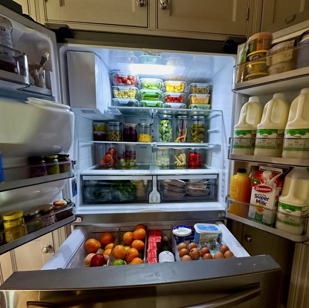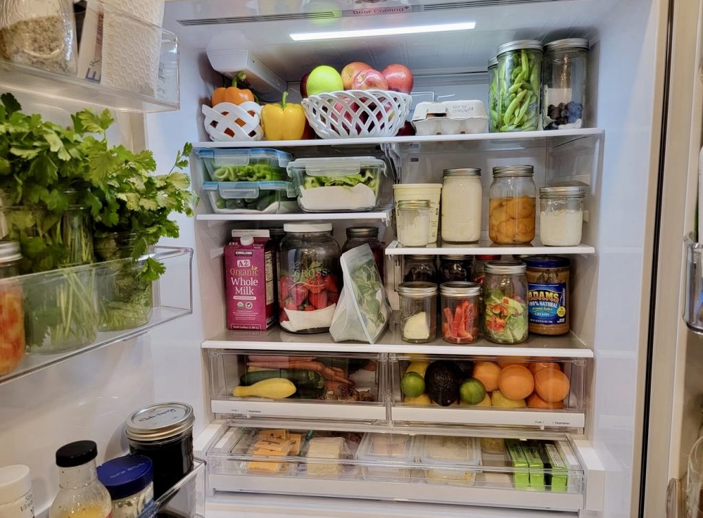 This fridge effortlessly combines function and freshness, featuring smoothie bottles, almond milk, chopped watermelon, and colorful mason jars. The top shelf is designed for quick grab-and-go items, while the lower shelves hold produce like kale, mangoes, and grapes for weekly restocking. It’s a perfect fit for those embracing plant-based diets or families seeking economical, health-focused storage ideas.