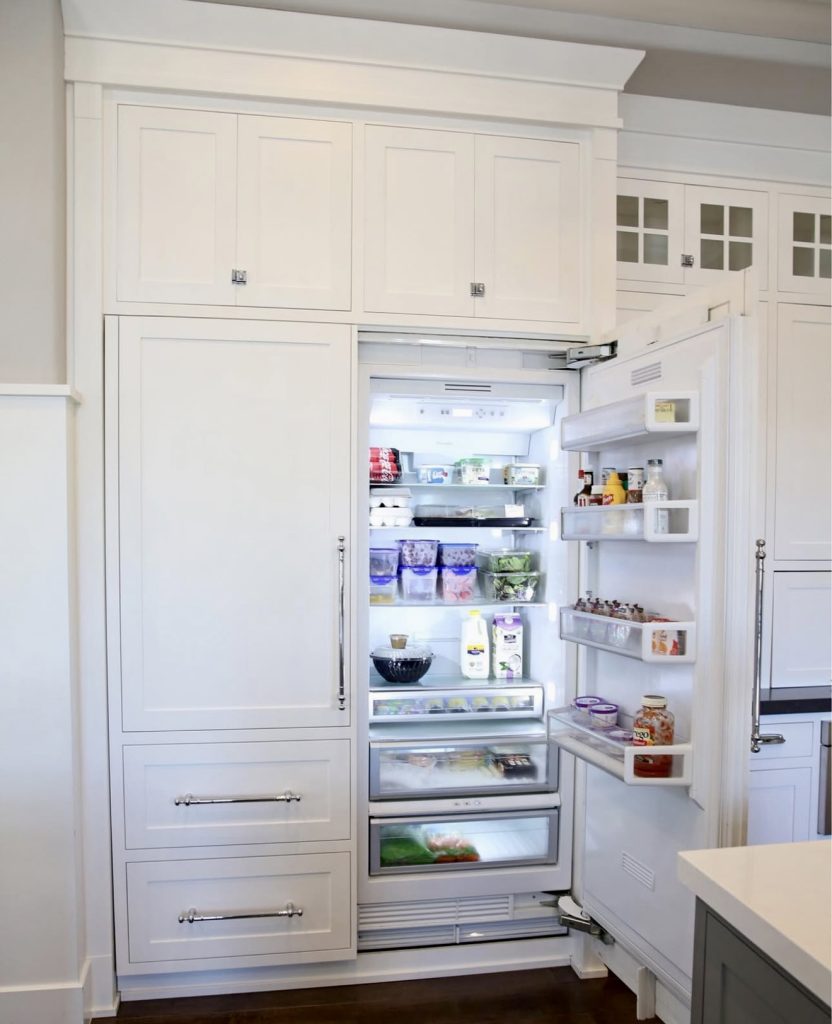This built-in French door refrigerator integrates flawlessly into a white kitchen, demonstrating that appliances can be both discreet and stylish. The storage is straightforward, with yogurt cups, leafy greens, juices, snacks, and meal ingredients neatly arranged. Ideal for minimalists and high-end homes, this design blends Hamptons charm with contemporary simplicity, perfect for garage kitchens or custom cabinetry.