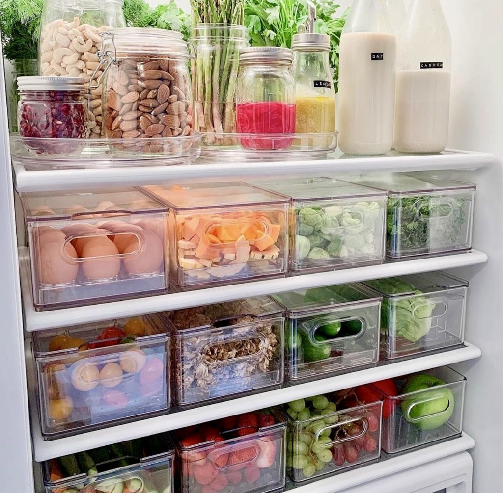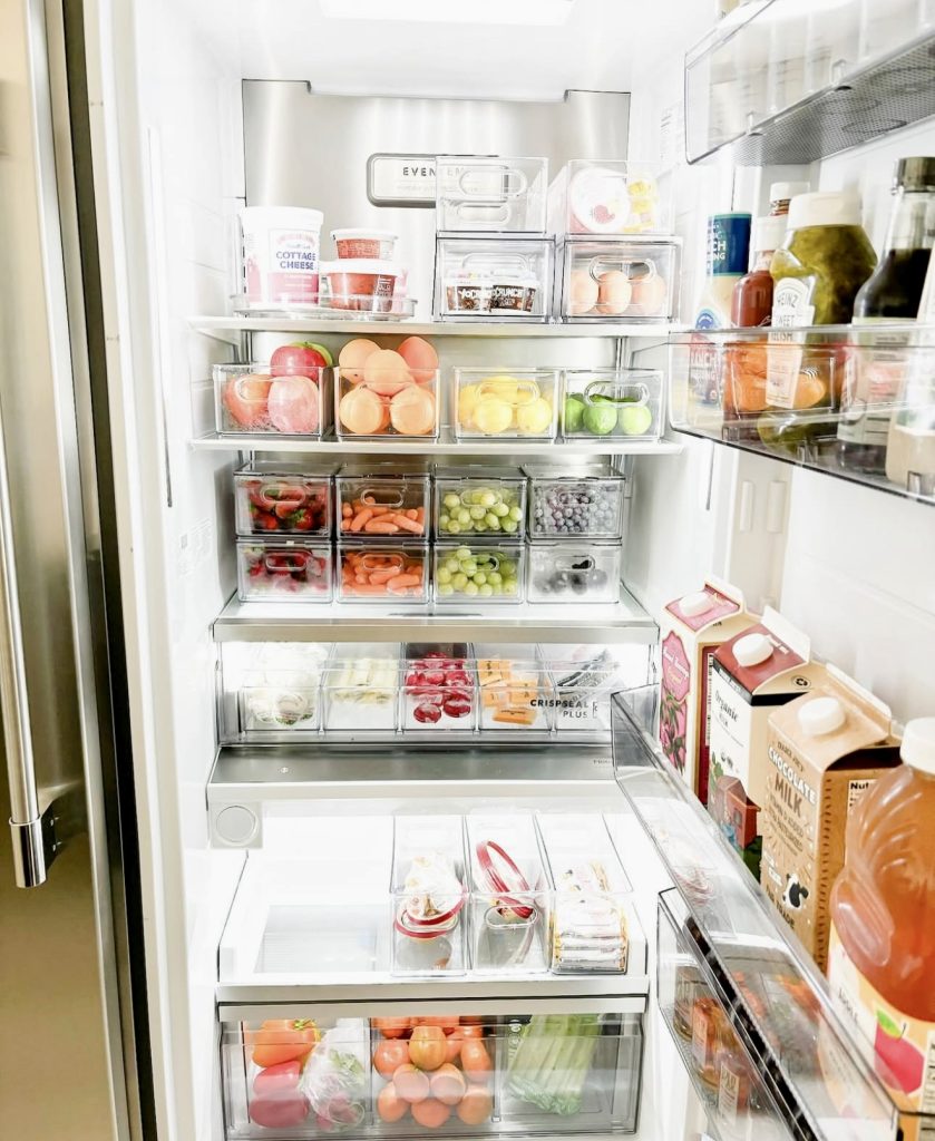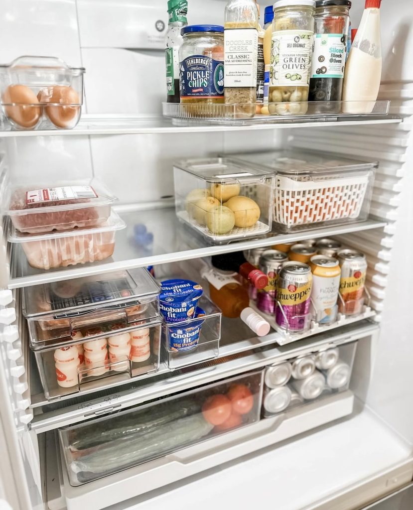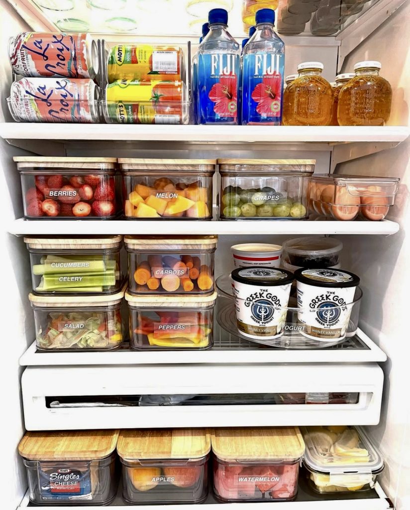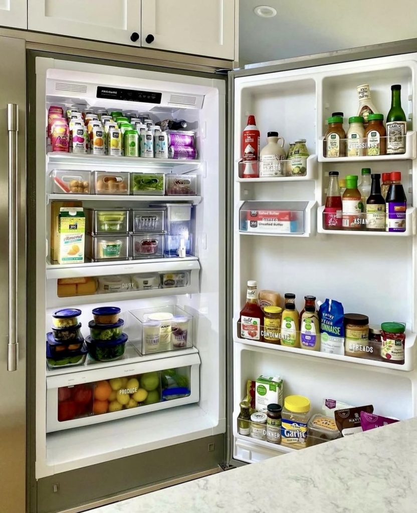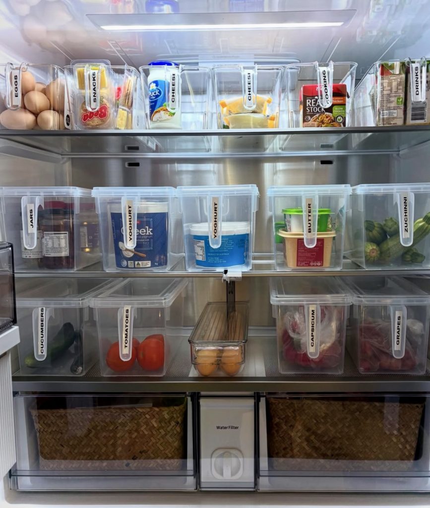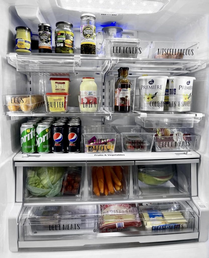 Perfect for those who thrive on lists and labels, this fridge features clearly marked bins for everything from eggs to zucchini, creating a neat, grid-like appearance that simplifies grocery planning. Clear bins maintain visibility while promoting uniformity. Many of these containers are budget-friendly and available on Amazon or can be repurposed from dollar store finds. Check out these clear storage bins for an easy upgrade.