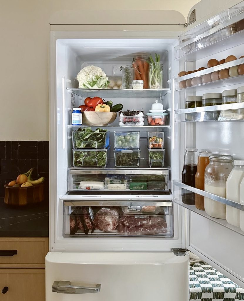 This fridge embraces bold color-blocking to create a lively yet highly functional space. Transparent bins hold kale and bell peppers, making it easy to check inventory at a glance—ideal for families or shared living situations. Glass bottles and mason jars add a nostalgic touch, while clearly labeled containers enhance usability. For those who love clever fridge hacks, these Amazon essential labels are a game-changer: fridge labels.