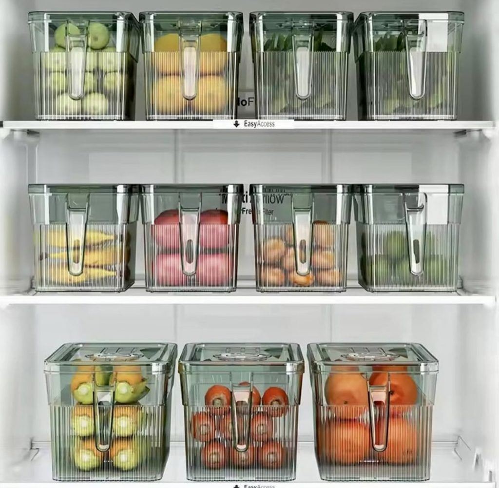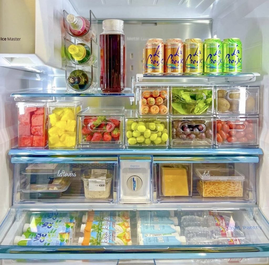 Defined by clean lines and color-coded bins, this fridge separates fruits and vegetables into individual transparent containers, making it easy to monitor freshness. This minimalist look pairs well with Samsung bespoke or modern side-by-side models. These stackable bins are an affordable way to revamp your fridge: stackable storage bins.