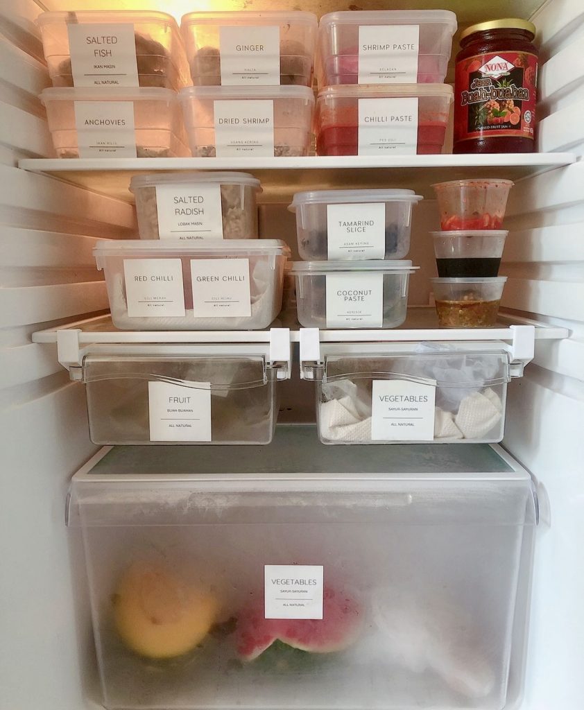 This fridge reflects a rich culinary heritage, featuring ingredients common in Southeast Asian or Indian cooking such as tamarind, shrimp paste, dried chili, and coconut paste, all meticulously labeled and organized. Ideal for specialty ingredient storage or small refrigerators, this layout supports authentic home cooking without sacrificing order or style.