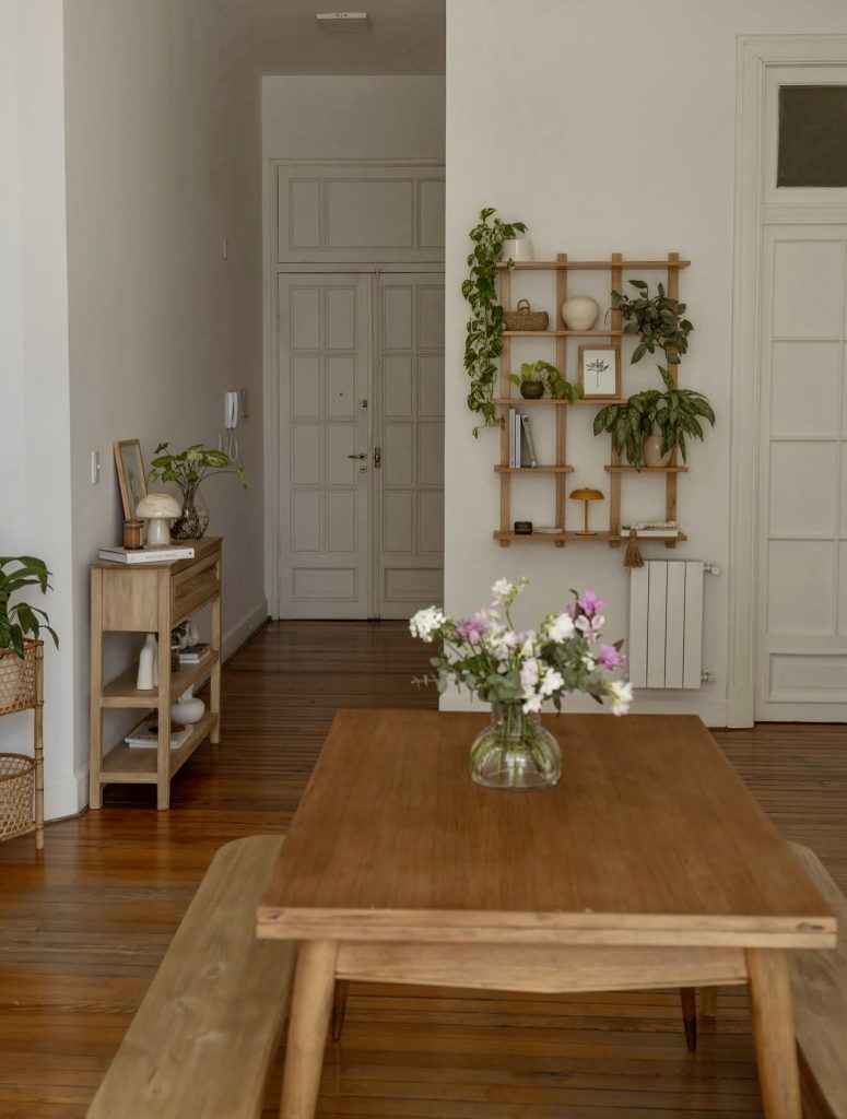 Wooden furnishings paired with simple greenery embody the Scandinavian ethos of cozy, uncluttered living. This style emphasizes warmth and tactile comfort without overwhelming a small footprint. The wooden dining table and shelving units create a structured yet natural layout, while fresh flowers add a lively, personal touch. Perfect for studios around 400 sq ft, this design balances minimalism with inviting charm, ideal for those seeking a serene and airy home.