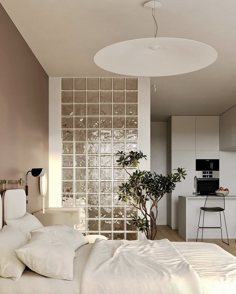 A partition made from glass blocks offers a chic way to define spaces while preserving privacy and allowing natural light to permeate. This design merges industrial flair with a soft neutral color scheme, creating a luxurious yet practical feel. The seamless flow between the sleeping and kitchen areas enhances the perception of spaciousness, especially beneficial in studios measuring 400 to 450 sq ft. Clean lines and an airy atmosphere make this a timeless choice for modern living.