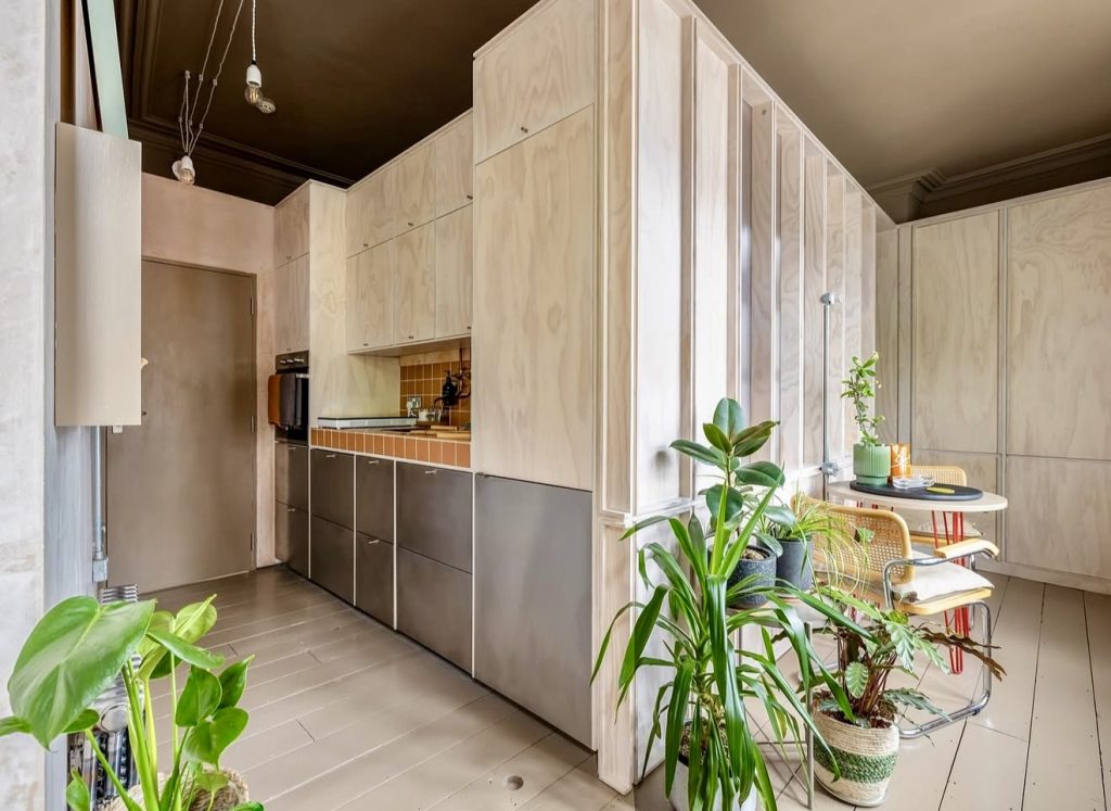 Light wood cabinetry combined with lush plants enlivens this small yet vibrant kitchen area. The fusion of industrial steel drawers and a rustic backsplash demonstrates how contrasting materials can harmonize beautifully. A compact dining table for two maintains efficiency without overcrowding, while vertical storage solutions maximize space and keep the floor clear. This blend of textures creates a kitchen that is both practical and stylish, perfect for a 500 sq ft studio.