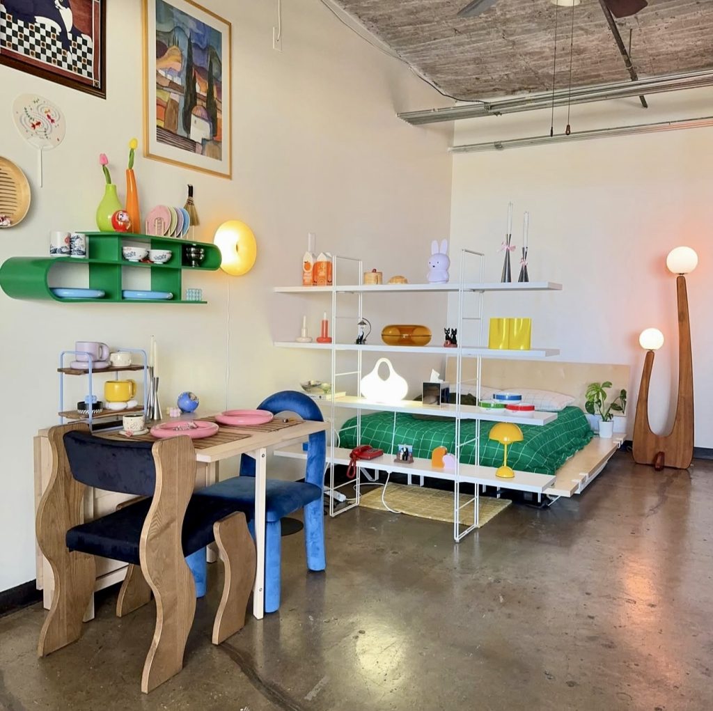 Bold hues and eclectic furnishings infuse this bohemian studio with energy and personality. Shelving units subtly separate the sleeping and dining zones while maintaining an open flow. Playful shapes and a vibrant green bedspread create a lively atmosphere that feels spacious rather than confined. The mix of unique lighting, artwork, and textures ensures this micro studio is memorable and full of character, proving that small spaces can be both functional and expressive.