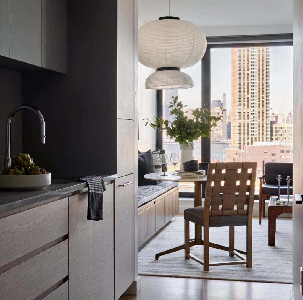 Positioning the dining area adjacent to expansive floor-to-ceiling windows amplifies the sense of openness in this studio. Built-in bench seating adds coziness and efficiency, while a round table offers versatile dining options within a compact footprint. The interplay of modern cabinetry and abundant natural light strikes a balance between luxury and practicality. For studios around 500 sq ft, leveraging window views is a smart strategy to visually expand the space and enhance city living.