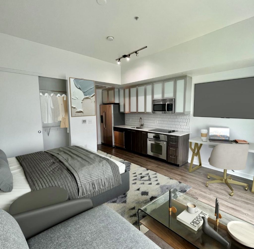 This design showcases a multifunctional studio that accommodates living, working, and cooking within a compact footprint. The bed, sofa, and desk coexist harmoniously alongside a streamlined kitchen, making it ideal for remote workers or couples. Scandinavian influences shine through in the clean lines, light flooring, and neutral tones. Clever storage solutions, such as a recessed closet and linear kitchen layout, optimize every inch of this 400 sq ft space.