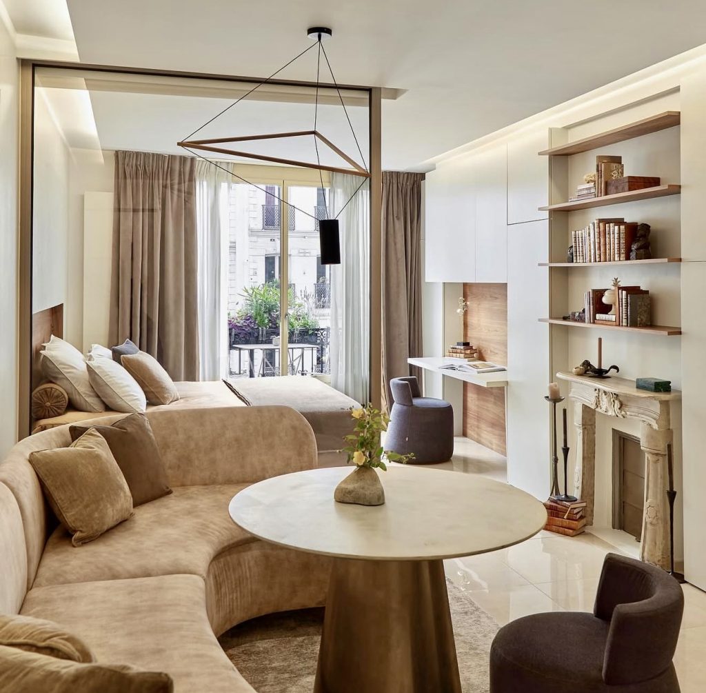 Elegant Studios Featuring Curved Furnishings and Built-Ins