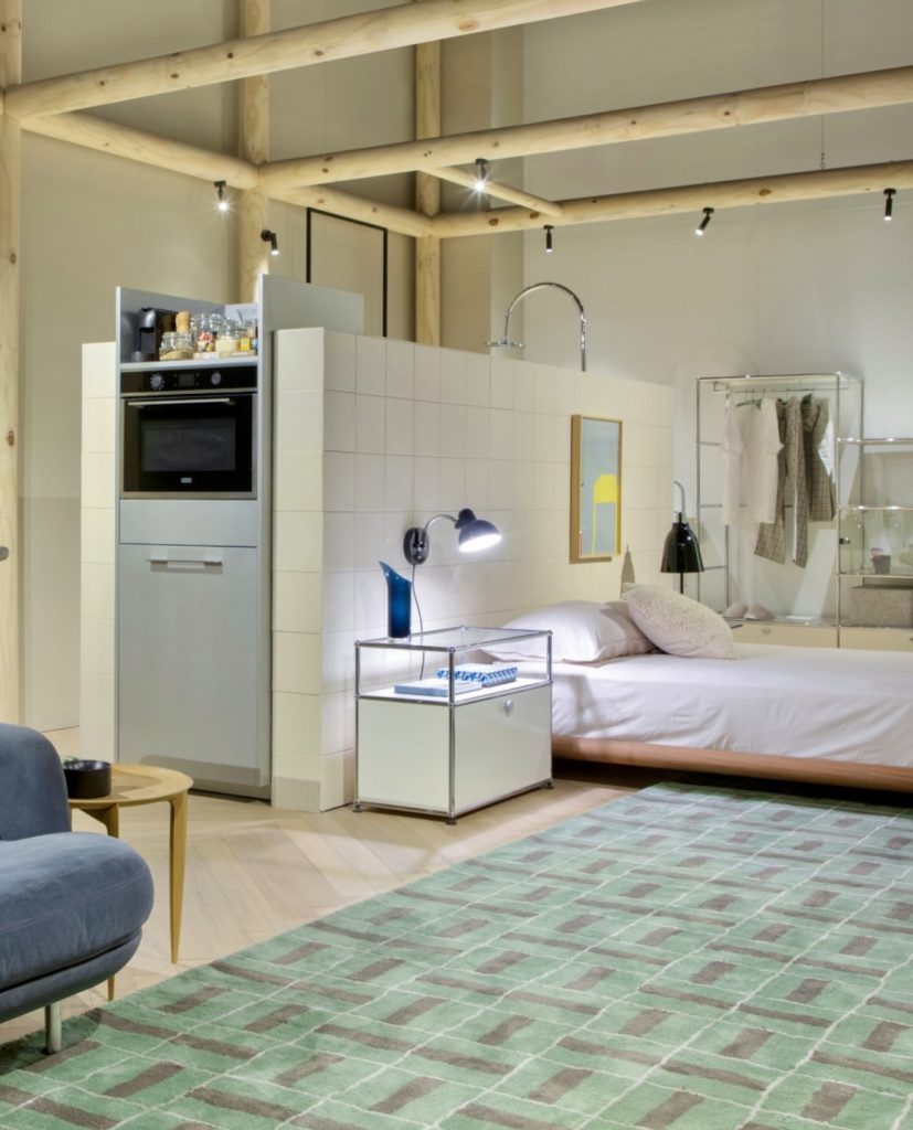 Featuring exposed beams and a minimalist palette, this industrial-inspired studio remains inviting and functional. A partial wall behind the bed delineates living and sleeping areas without overwhelming the compact space. A patterned rug adds a playful softness, balancing the raw architectural elements. This layout efficiently integrates storage, kitchen, and relaxation zones, proving that smart spatial planning can transform even the smallest studios into comfortable homes.