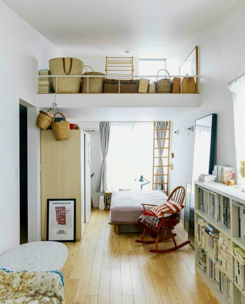 By elevating storage above the bed, this studio cleverly frees up floor space, allowing the main living area to feel open and uncluttered. Natural materials like woven baskets and wood tones introduce rustic charm that softens the minimalist design. Lofted storage is an excellent strategy for micro apartments, blending Scandinavian simplicity with practical warmth—ideal for those with many belongings but limited square footage.