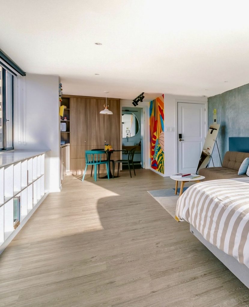 This open-plan studio uses vibrant colors and contemporary finishes to create an illusion of spaciousness. A lively wall mural and brightly colored chairs inject personality into the streamlined design. Keeping furniture against the walls and the floor clear optimizes light flow and movement. Suitable for studios around 450 to 500 sq ft, this approach proves that small spaces can be bold and stylish without feeling overwhelming.
