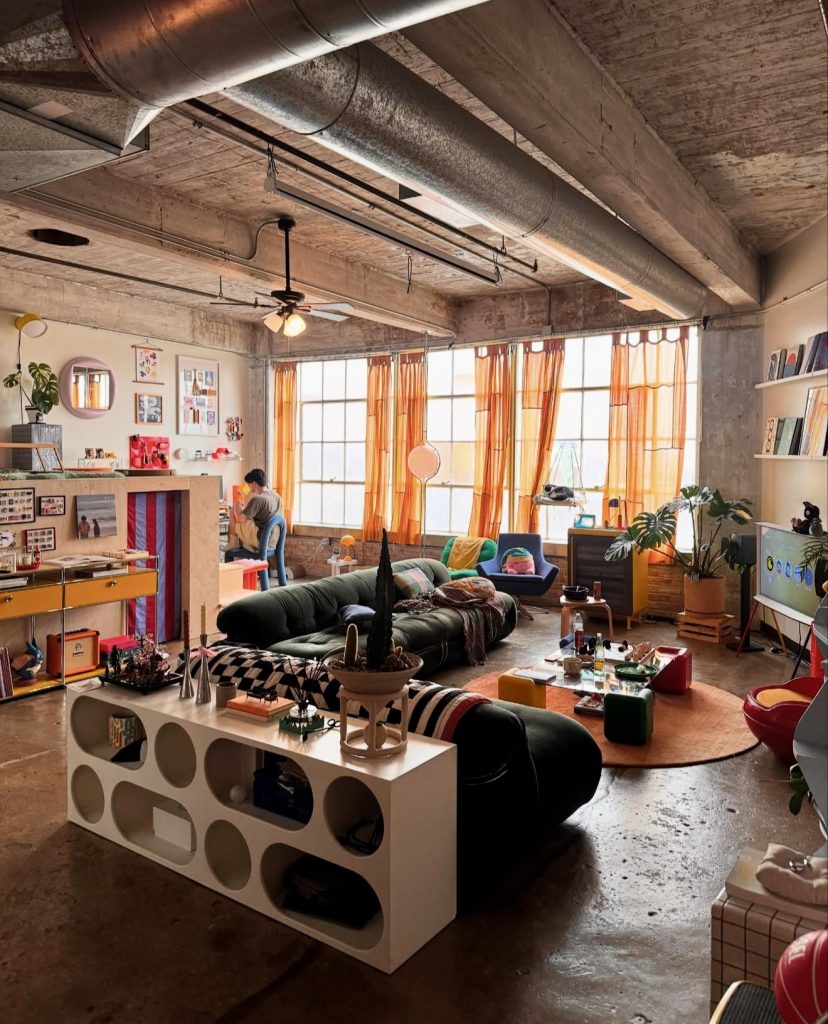 Raw industrial elements like exposed ceilings and ductwork are softened by colorful furnishings and vintage pieces, creating a unique bohemian vibe. Large windows ensure ample natural light, preventing the space from feeling dark despite darker flooring. The eclectic mix of textiles and hues adds warmth and coziness, transforming the loft into a personal sanctuary that balances openness with comfort.