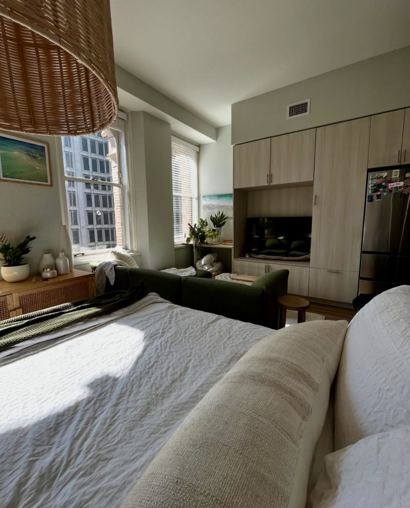 Light finishes and organic textures evoke a breezy coastal vibe in this compact studio. The layout seamlessly integrates a bed, sofa, and built-in cabinetry without clutter. Greenery and woven accents soften the cabinetry’s edges, adding a bohemian warmth. This design is especially effective in 400 sq ft apartments, where multifunctional furniture is essential. It captures the essence of seaside living, even in an urban setting.